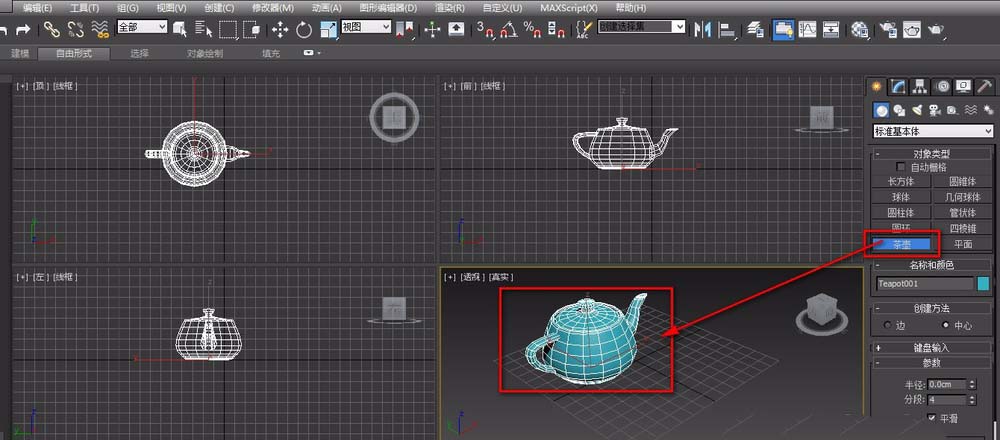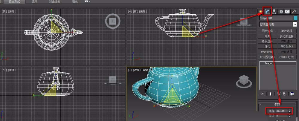 4、先選定好自己創建的模型,然后點擊右側的修改命令,下面就會顯示出這個茶壺的相關數據,這個半徑的單位是cm,所以這里的創建的模型的單位都是厘米,不過單位是可以自己設置的。