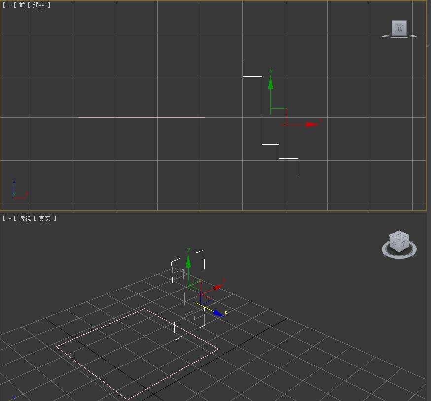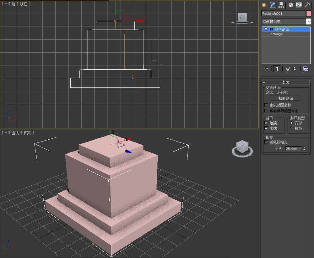 3、在前視圖中繪制如圖所示的線形,將剛繪制完成的矩形剖面處于選中狀態,添加【倒角剖面】修改命令,單擊【拾取剖面】按鈕,在前視圖中拾取花壇底座的線性,生成花壇的底座