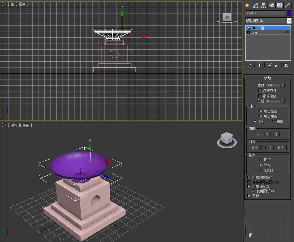 6、在前視圖中繪制如圖所示的線形,在修改器列表中選擇【車削】修改命令,得到花壇頂部的造型,最終效果如圖所示。