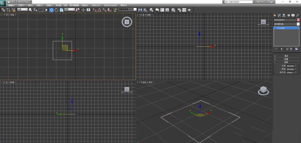 2、在頂視圖中繪制如圖所示的矩形,在修改器列表中修改矩形的參數,長度為500mm,寬度為500mm,效果如圖所示