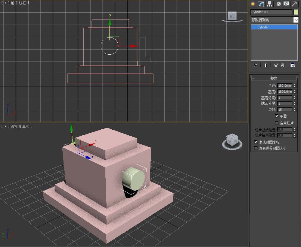 4、在前視圖中創建【半徑】為180mm,【高度】為1800mm的圓柱體,修改【高度分段】為1,【邊數】為15,將其調整至合適的位置,如圖所示