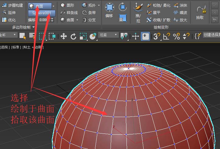 2、選中球體,來到石墨建模工具的自由形式選項卡,切換繪制于:表面,然后點擊拾取按鈕,拾取這個球面模型。
