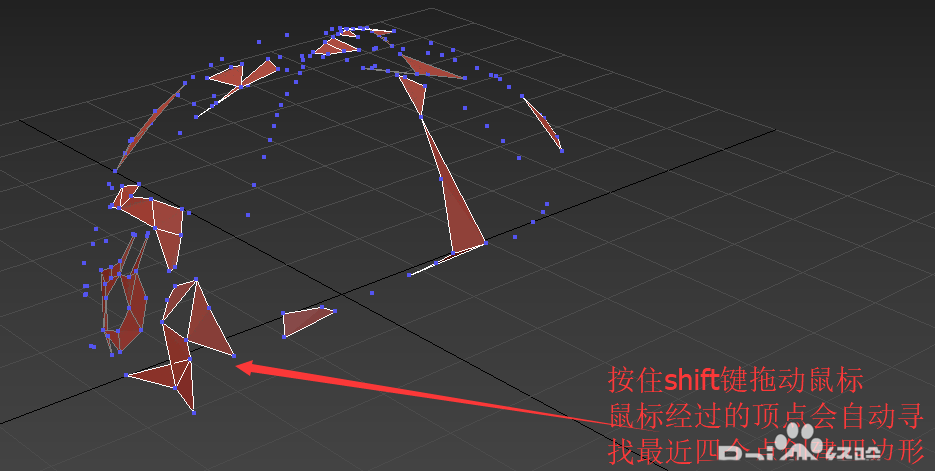 5、按住shift鍵拖動鼠標,鼠標經過的頂點會自動尋找最近的四個頂點,并創建一個四邊形。