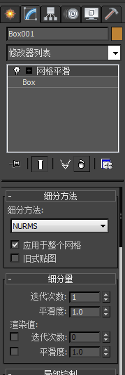 6、在修改命令面板中選擇“網(wǎng)格平滑”命令。將“迭代次數(shù)”設置為1,激活頂點按鈕