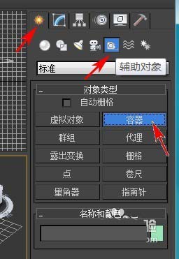 2、創(chuàng)建容器:在 “創(chuàng)建”面板上,單擊 “輔助對象”。在“對象類型”卷展欄中,單擊“容器”。