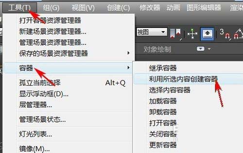 4、根據(jù)選定對象創(chuàng)建容器:選擇要在容器中放置的對象后,從“工具”菜單中,選擇“容器”—“利用所選內(nèi)容創(chuàng)建容器”。