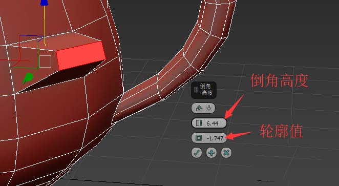 2、倒角的用法:通過按鈕右邊的小三角按鈕打開設置小面板,如圖設置倒角的高度和輪廓值(收縮/擴大數值)