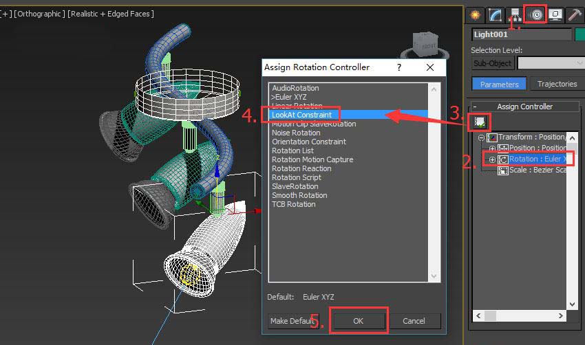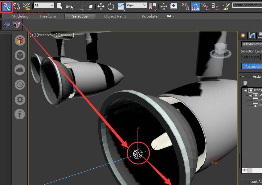 7、最后一步就是調整射燈的姿勢了,先調整'Select LookAt Axis'(注視軸向),如果位置還有偏差可以通過'Set Orientation'(設置方向)來微調。