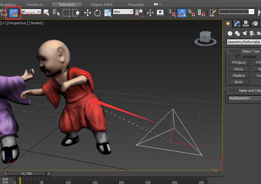 然后通過主工具欄的 綁定到空間扭曲 功能將 Bomb與模型連接.
