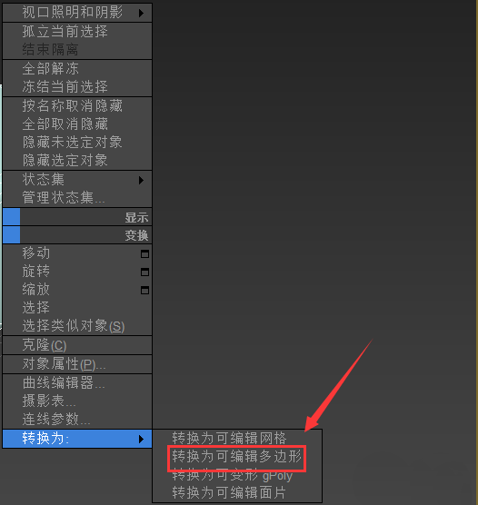 7、點(diǎn)擊轉(zhuǎn)換為選項(xiàng),在其下拉菜單哪里選擇轉(zhuǎn)換為可編輯多邊形選項(xiàng),如圖所示: