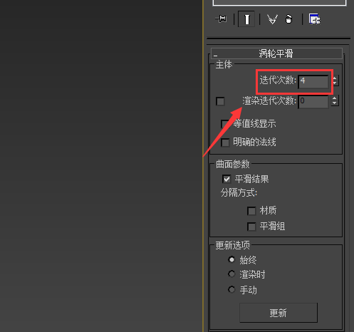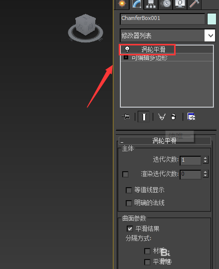 13、添加渦輪平滑修改器后,在修改設(shè)置迭代次數(shù)為4,如圖所示: