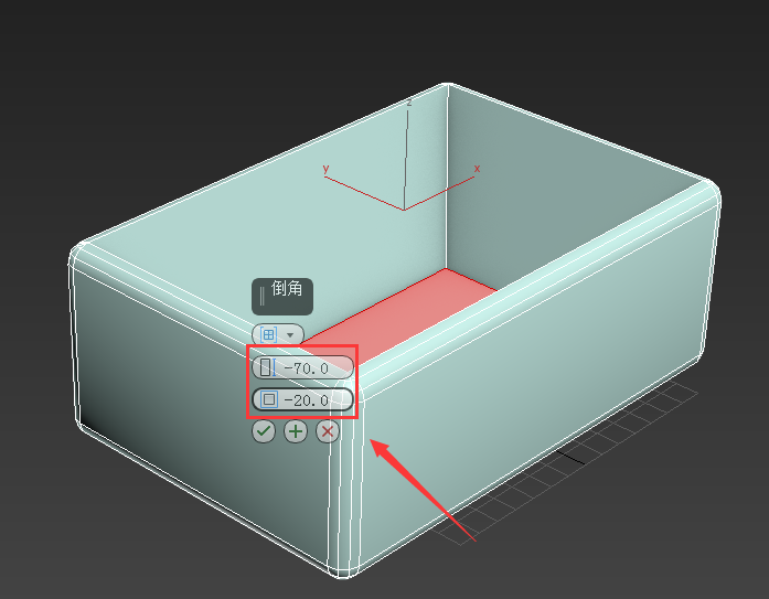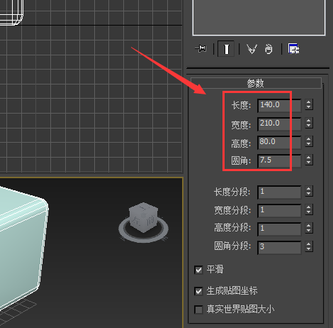 5、選擇創(chuàng)建的切角長方體,在修改里設(shè)置參數(shù)如圖所示: