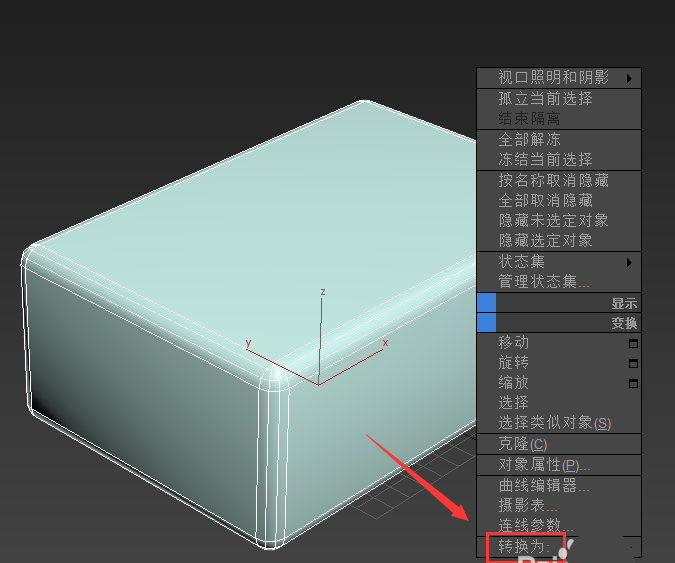 6、在透視圖里選擇該長方體點(diǎn)擊鼠標(biāo)右鍵在彈出的有機(jī)愛你菜單里選擇轉(zhuǎn)換為選項(xiàng),如圖所示: