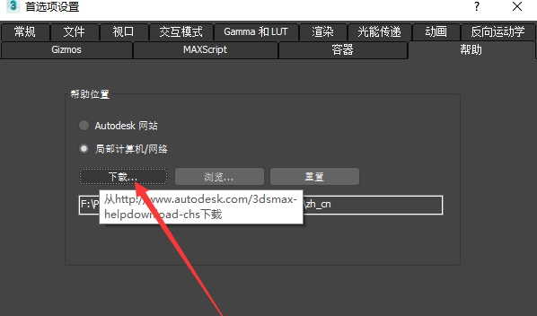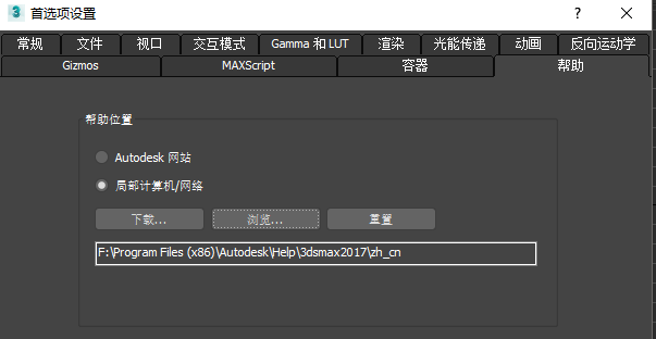 5、安裝結(jié)束后,回到3DS MAX,再次來到首選項(xiàng)設(shè)置的幫助面板,點(diǎn)擊瀏覽按鈕,瀏覽到 .../Programs Files(x86)/Autodesk/Help/3dsmax2017/zh_cn這個(gè)路徑。