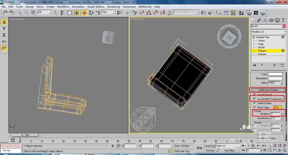 9、在修改命令面板中勾選【Subdivision Surface】(細(xì)分曲面)卷展欄下的【Use NURMS Subdivision】(使用NURMS細(xì)分)復(fù)選框,修改【Iterations】(迭代次數(shù))值為1,效果如圖所示。(下面繼續(xù)制作椅子腿造型。)