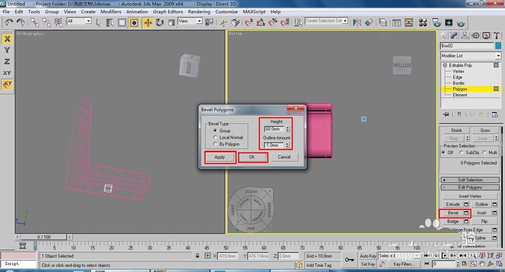 10、在頂視圖中創(chuàng)建一個(gè)45*45*50的長(zhǎng)方體,段數(shù)分別設(shè)置為1,將長(zhǎng)方體轉(zhuǎn)換為【Editable Poly】(可編輯多邊形),按下4鍵,進(jìn)入(多邊形)層級(jí),在透視圖中選擇下面的面,使用【Bevel】(倒角)命令制作梯形的效果,連續(xù)單擊【Apply】(應(yīng)用)按鈕7次,最后單擊【OK】按鈕,效果如圖。