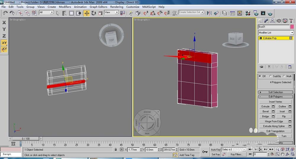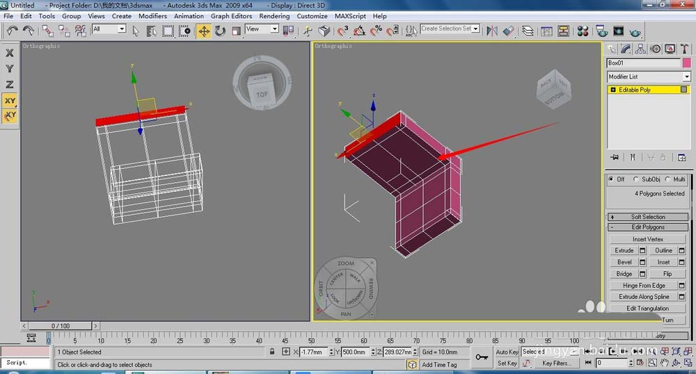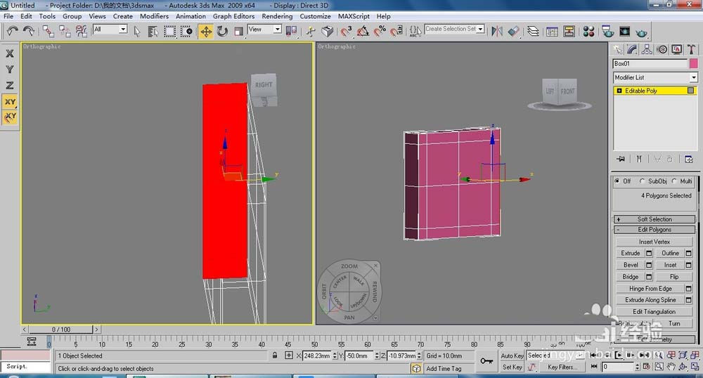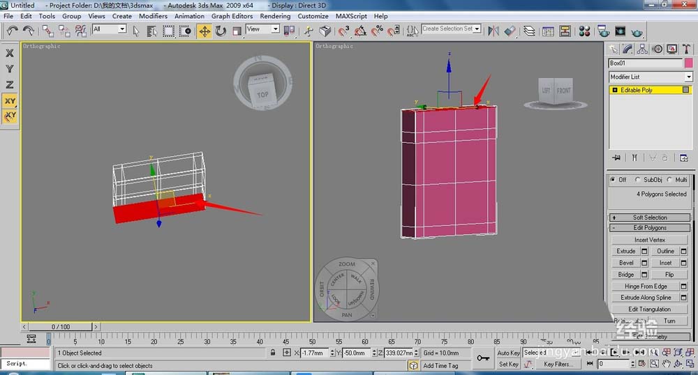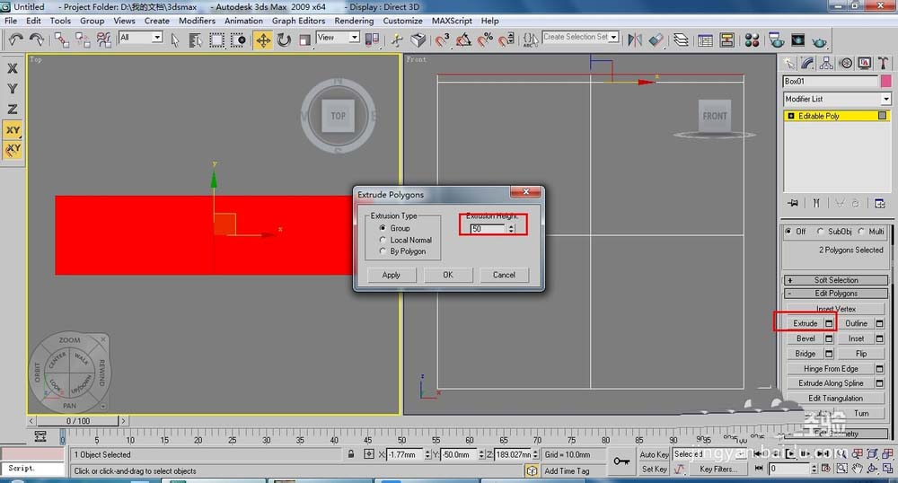 2、將長(zhǎng)方體轉(zhuǎn)換為【Editable Poly】(可編輯多邊形)按下4鍵,進(jìn)入(多邊形)層級(jí),在透視圖中選擇側(cè)面的面,單擊【Extrude】(擠出)右側(cè)的小按鈕,設(shè)置擠出高度為50,單擊【OK】按鈕。