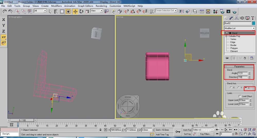 11、在修改器列表中執(zhí)行【Bend】(彎曲)命令,設(shè)置【Angle】(角度)為12,【Direction】(方向)為150,如圖。