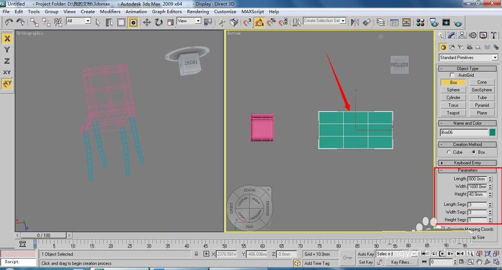 13、餐椅的造型已經(jīng)制作出來了,下面我們來制作餐桌的造型。在頂視圖中創(chuàng)建一個(gè)800*1600*40的長(zhǎng)方體,段數(shù)分別設(shè)置為3、3、1,作為餐桌,如圖。