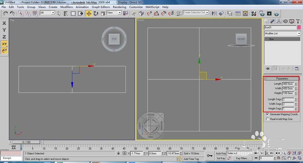 1、單擊(創(chuàng)建)/(幾何體)/【Box】(長(zhǎng)方體)按鈕,在前視圖中創(chuàng)建一個(gè)長(zhǎng)方體,參數(shù)及形態(tài)如圖。