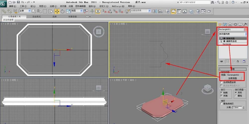 6、選中茶幾桌面,選擇修改器中的倒角坡面,點擊拾取剖面,選擇剛才的那個小矩形即可