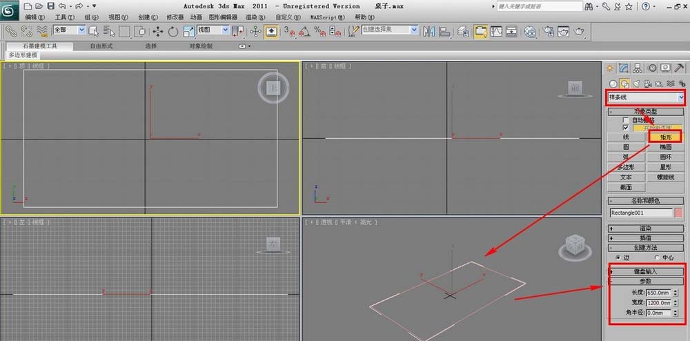 1、使用樣條線中的矩形制作一個茶幾的表面