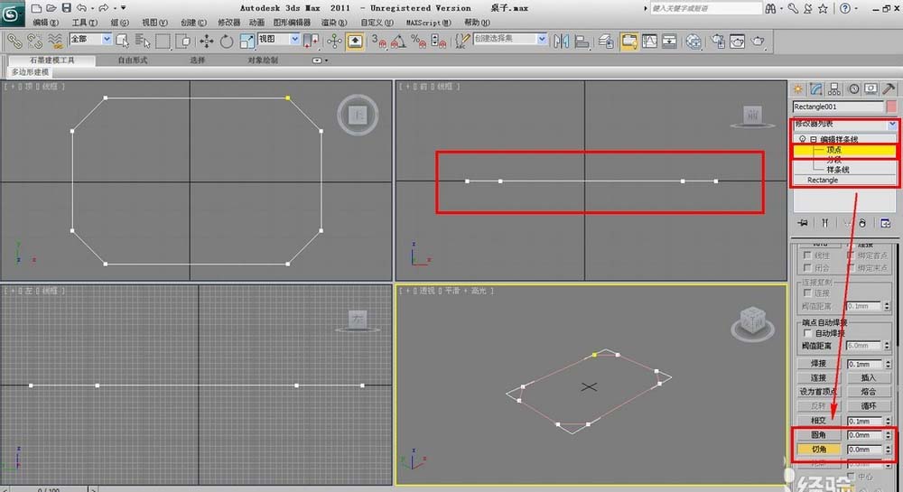 2、對矩形添加修改命令為編輯樣條線,并選擇頂點,點擊切角(大小為100左右)
