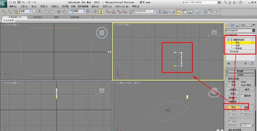 4、選擇修改命名中的編輯樣條線,先選線段,將其中一線段去掉,再選擇點,點擊優化,添加點