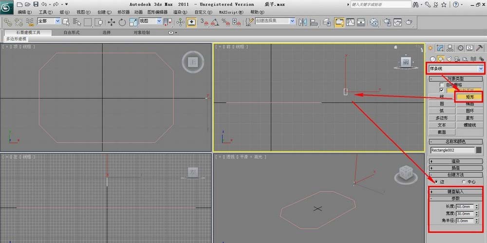 3、繼續使用樣條線中的矩形,繪制一個矩形(該矩形為倒角剖面被選擇的對象),長度大小為茶幾桌面的厚度
