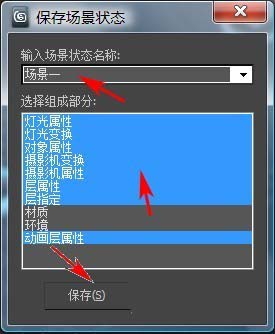 3、在“保存場景狀態”對話框中,高亮顯示要保存的場景狀態部分,然后輸入一個名稱,單擊“保存”按鈕。這樣便將場景狀態保存到 MAX 文件。