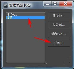 8、刪除場景狀態。在場景狀態列表中,高亮顯示要刪除的場景狀態。單擊“刪除”按鈕。場景狀態便從 MAX 文件中刪除。