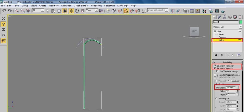 5、在左視圖中繪制如圖的線(xiàn)形,修改渲染卷展欄下的厚度值為35mm,作為支架。