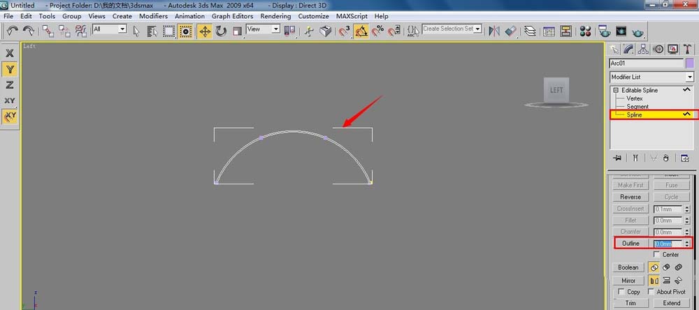 2、為圓弧添加【Edit Spline】(編輯樣條線(xiàn))命令,進(jìn)入(樣條線(xiàn))層級(jí),為繪制的圓弧添加數(shù)量為10的輪廓,如圖。