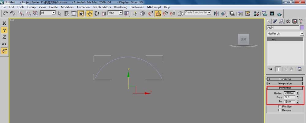 1、在左視圖中繪制一個(gè)半圓弧,參數(shù)及形態(tài)如圖。