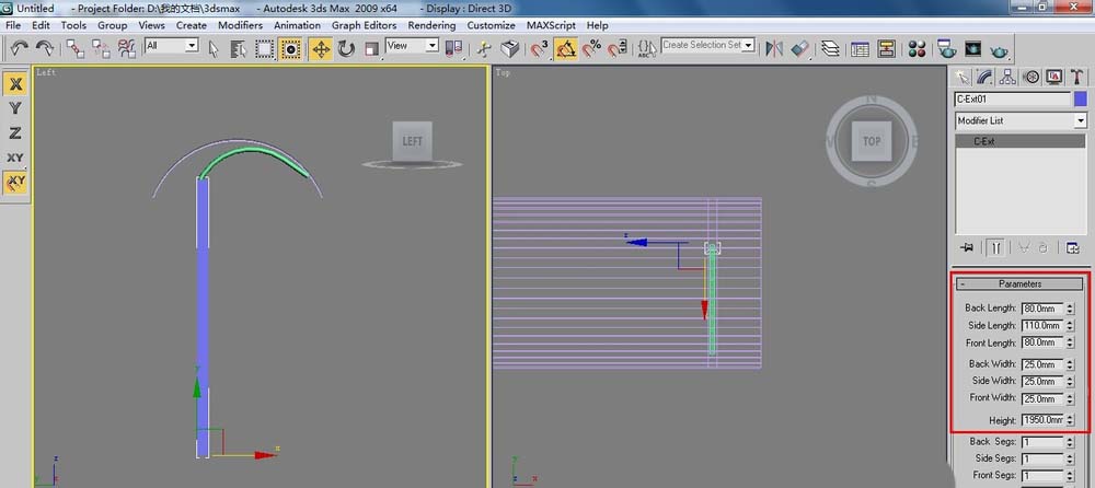 6、在頂視圖中創(chuàng)建如圖所示的C形拉伸體,然后將其進(jìn)行旋轉(zhuǎn)90度,作為候車(chē)亭的糟形鋼立柱。