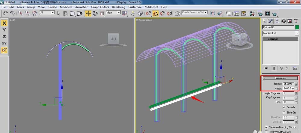 7、將制作的立柱、支架和弧形梁進(jìn)行復(fù)制,調(diào)整至合適的位置。在左視圖中創(chuàng)建半徑為25、高度為3400的圓柱體,調(diào)整至合適的位置,再進(jìn)行復(fù)制,如圖所示。