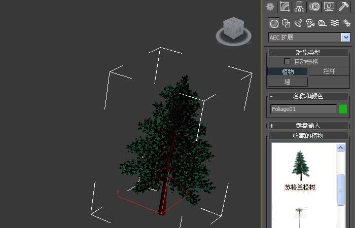 4、在【AEC擴(kuò)展】的面板上,鼠標(biāo)左鍵單擊【植物】下的(蘇格蘭松樹(shù)),接著在透視圖中,拖動(dòng)繪制一個(gè)蘇格蘭松樹(shù)出來(lái),如下圖所示。