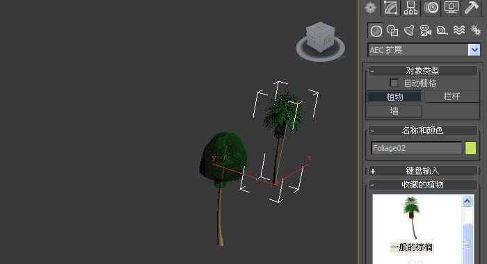 3、在【AEC擴(kuò)展】的面板上,鼠標(biāo)左鍵單擊【植物】下的(一般棕櫚樹(shù)),接著在透視圖中,拖動(dòng)繪制一個(gè)一般棕櫚樹(shù)出來(lái),如下圖所示。