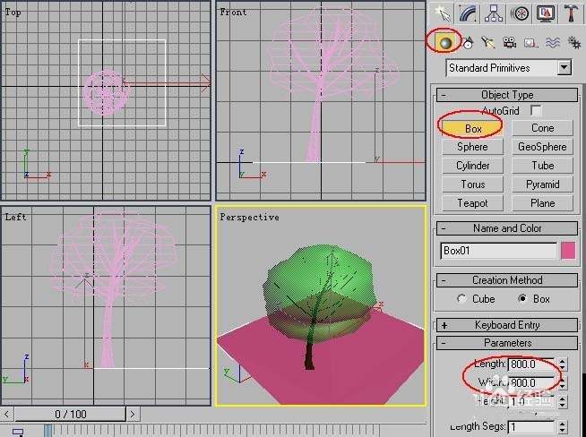 3、在頂視圖中創建一個BOX,主要是為了接收樹產生的陰影。