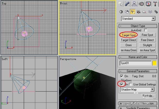 5、在前視圖中創建一個目標聚光燈,主要是為投放陰影。