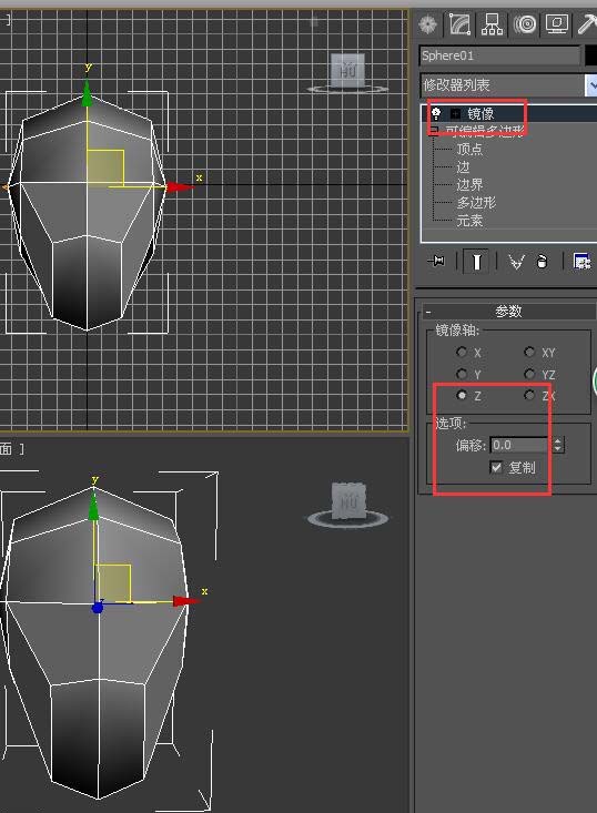 6、對剩下的多邊形使用“鏡像”修改器,在修改器的選項上注意選擇正確的鏡像軸和勾選“復(fù)制”,這樣我們只要對模型的一邊就行建模就可以了,不必要左右兩邊去重復(fù)的調(diào)整。