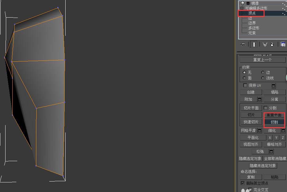 10、在模型中在“頂點”層級中使用“切割”在模型中進(jìn)行頂點的繪制。