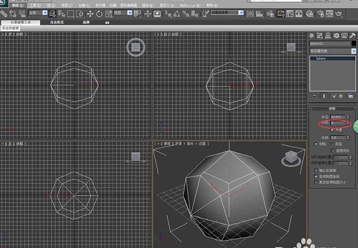 1、在左視圖建立“圓形,”在修改面板中把圓形的段數(shù)修改為8