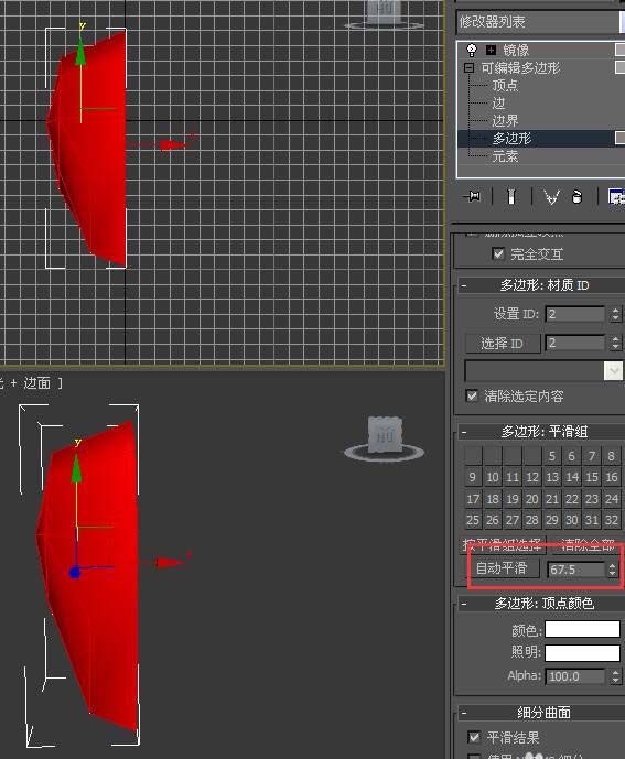 7、在模型“多邊形”下選擇所有的多邊形,然后在右側(cè)選項中點擊“自動平滑”,并輸入一個合適的平滑值。這樣可以讓模型在視圖中看起來更平滑圓潤,方便我們建模,因為人物頭部是一個平滑圓潤的模樣
