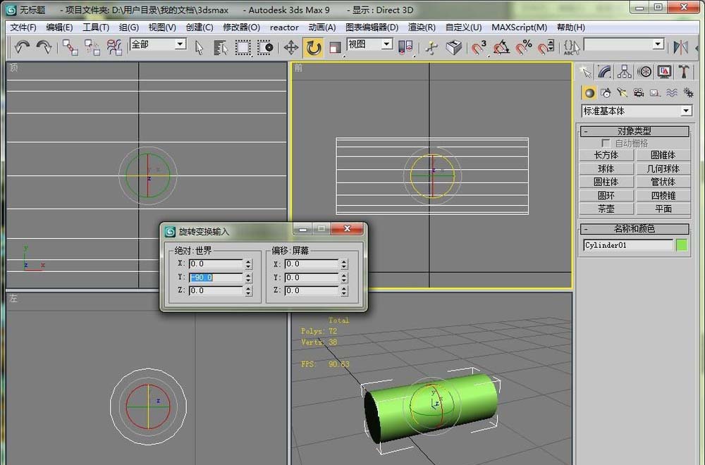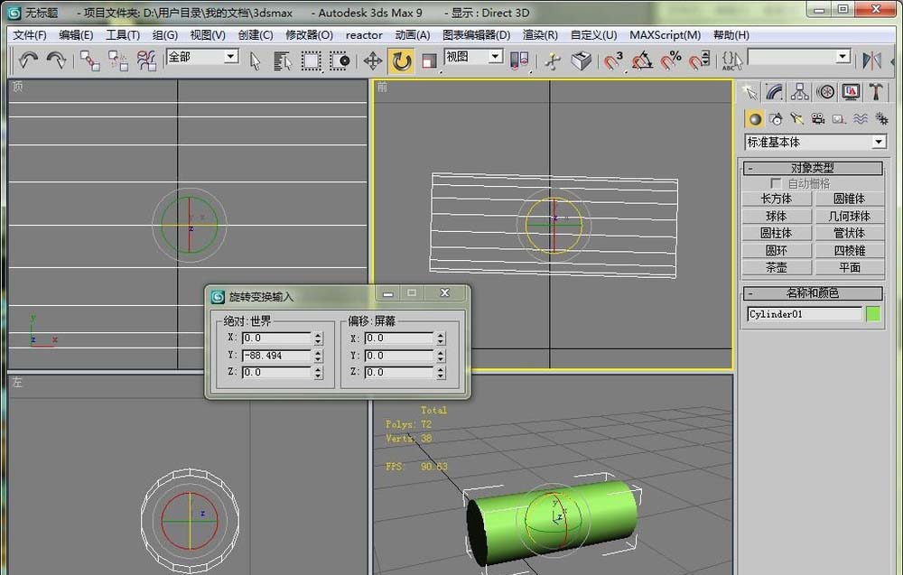 3、直接選擇旋轉工具,然后就可以在視圖里旋轉圓柱體了。這里在前視圖比較好操作。