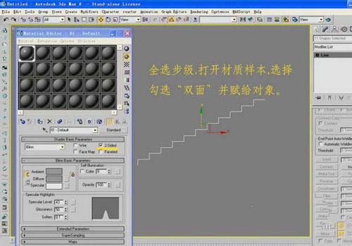 7、打開材質編輯器,默認快捷鍵M,全選所有的樓梯踏步模型,給它們賦予一個材質,并勾選“雙面”選項,其他參數保存默認即可;