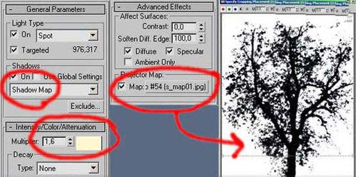 好,我的場景幾乎制作完了。里斯本市的光照是很驚人的:城市的街道筆直,種有樹木,制作一個陰影貼圖的投影是必要的,我使用了一張陰影貼圖,選擇了它的一部分來生成陰影和模糊特效。在這個場景中使用了兩個Target Spots(目標聚光燈):一個燈光設置為2.5 Multiplier(亮度倍增),這樣做可以在墻體上投射出很強的高光,光照顏色為黃色RGB(255;246;210),選擇Shadow Map(陰影貼圖)方式;并為Projector Map(投影貼圖)指定這張樹木陰影貼圖。另一個燈光是由第一個客隆出來的,1.5 Multiplier(亮度倍增),光照顏色和陰影貼圖相同。