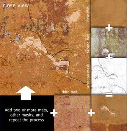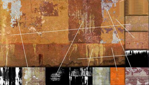 墻體:在參考圖片的輔助下,我決定制作一張復雜的貼圖,因此我認為必須在Photoshop中對貼圖進行處理,才能制作出有污痕的紋理。墻體的大部分區域被不同的顏色粉刷過很多次,因此墻體有很多圖層,使得它的紋理非常多樣。我使用了7種不同的紋理,這些紋理帶有許多蒙板,在下面你可以看到如何選擇蒙板和混合圖層。