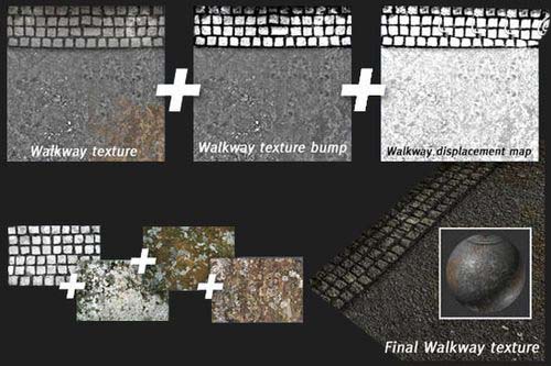 人行道:這是一個棘手的部分,我必須在Photoshop中合成出這個貼圖,因為我想制作出一張將混凝土質感與典型的葡萄牙風格道路完美融合的貼圖。因此我使用了凹凸和置換兩種貼圖來制作這種紋理效果。