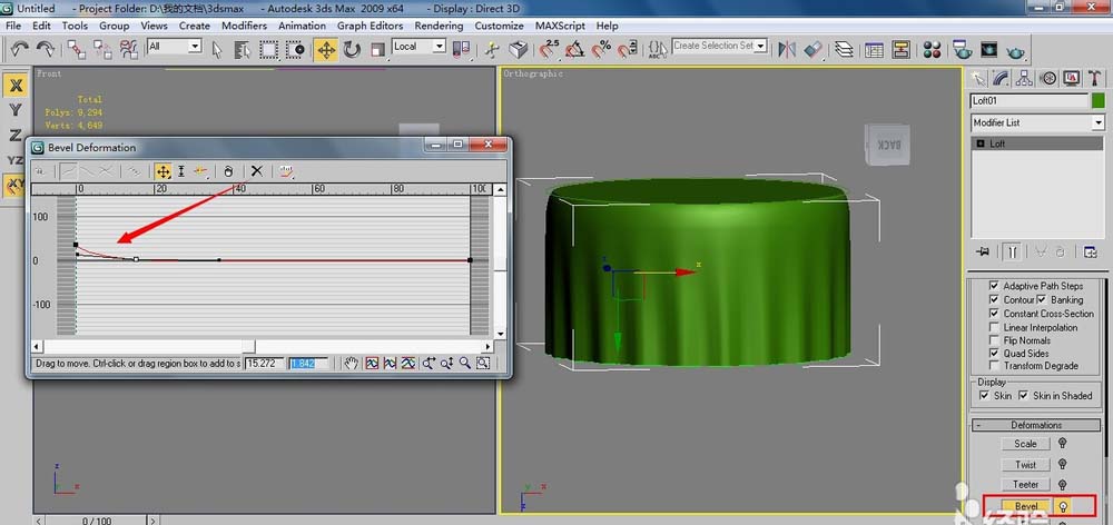 4、單擊修改命令面板【-Deformations】(變形)卷展欄下的【Bevel】(倒角)按鈕,彈出【Bevel Deformation】(倒角變形)窗口。在控制線上添加一個點,調整形態(tài),如圖所示。